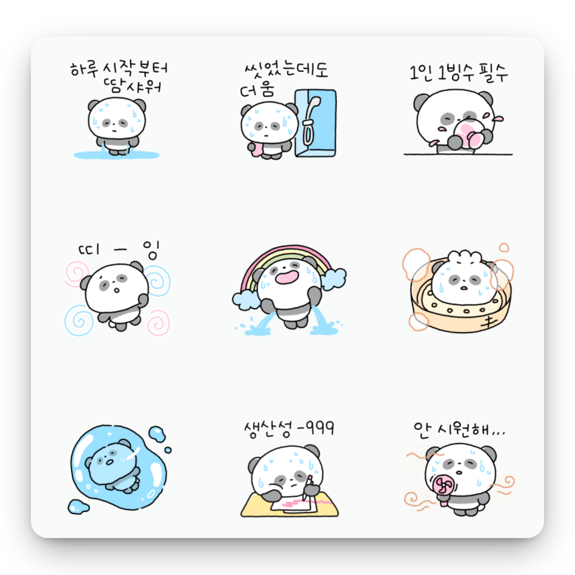 이건 정말.. 보는 순간 "완전 난데?" 싶은 캐릭터예요. 귀여운 판다가 아침부터 저녁까지 줄줄 흐르는 땀과 함께 그야말로 여름날 우리 모습 그대로를 보여주거든요.