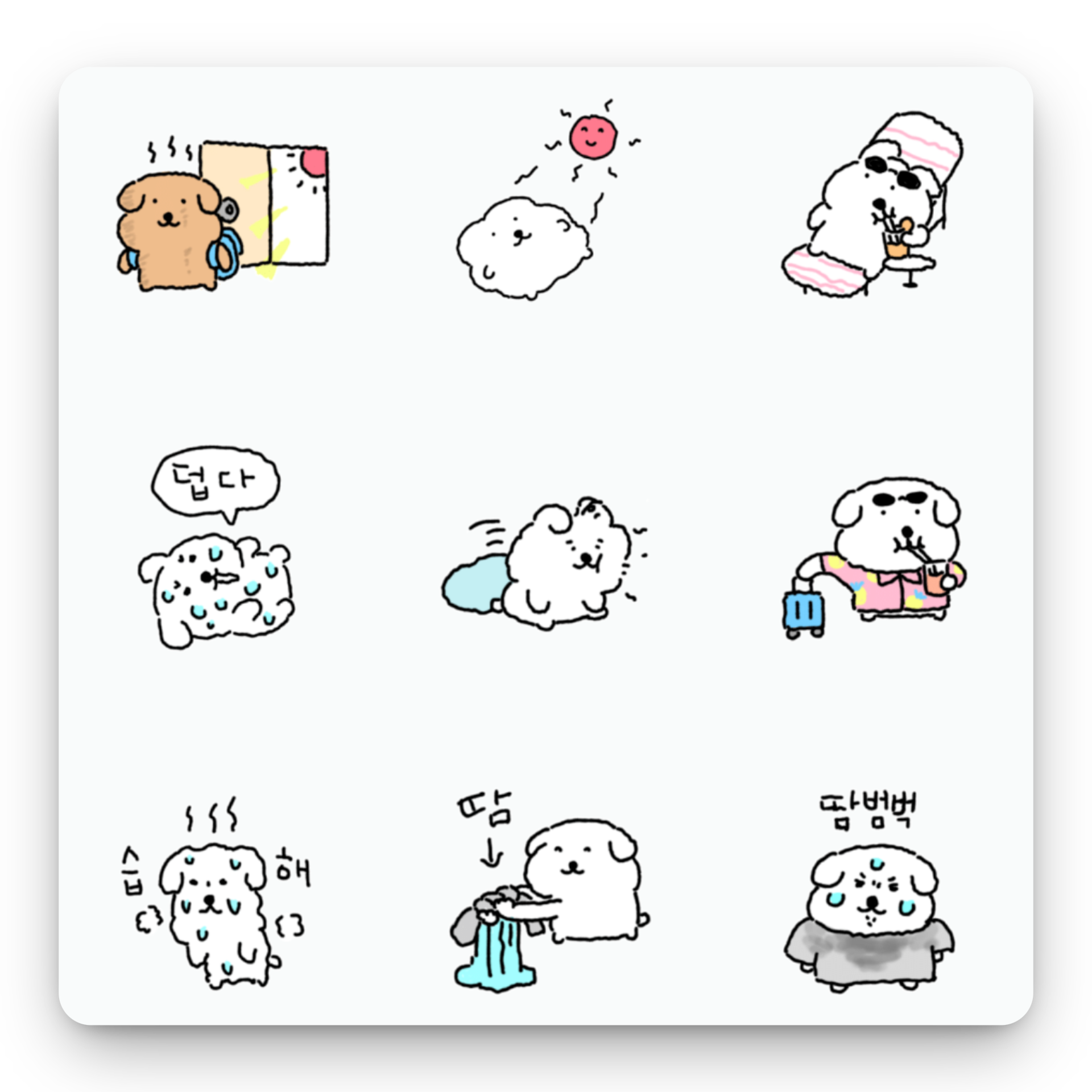 여름이면 유독 축축 처지고 자기 표정도 잘 모를 만큼 멍해질 때가 있잖아요. ‘찹쌀이’는 딱 그 순간을 표현한 것 같은 강아지 캐릭터예요.