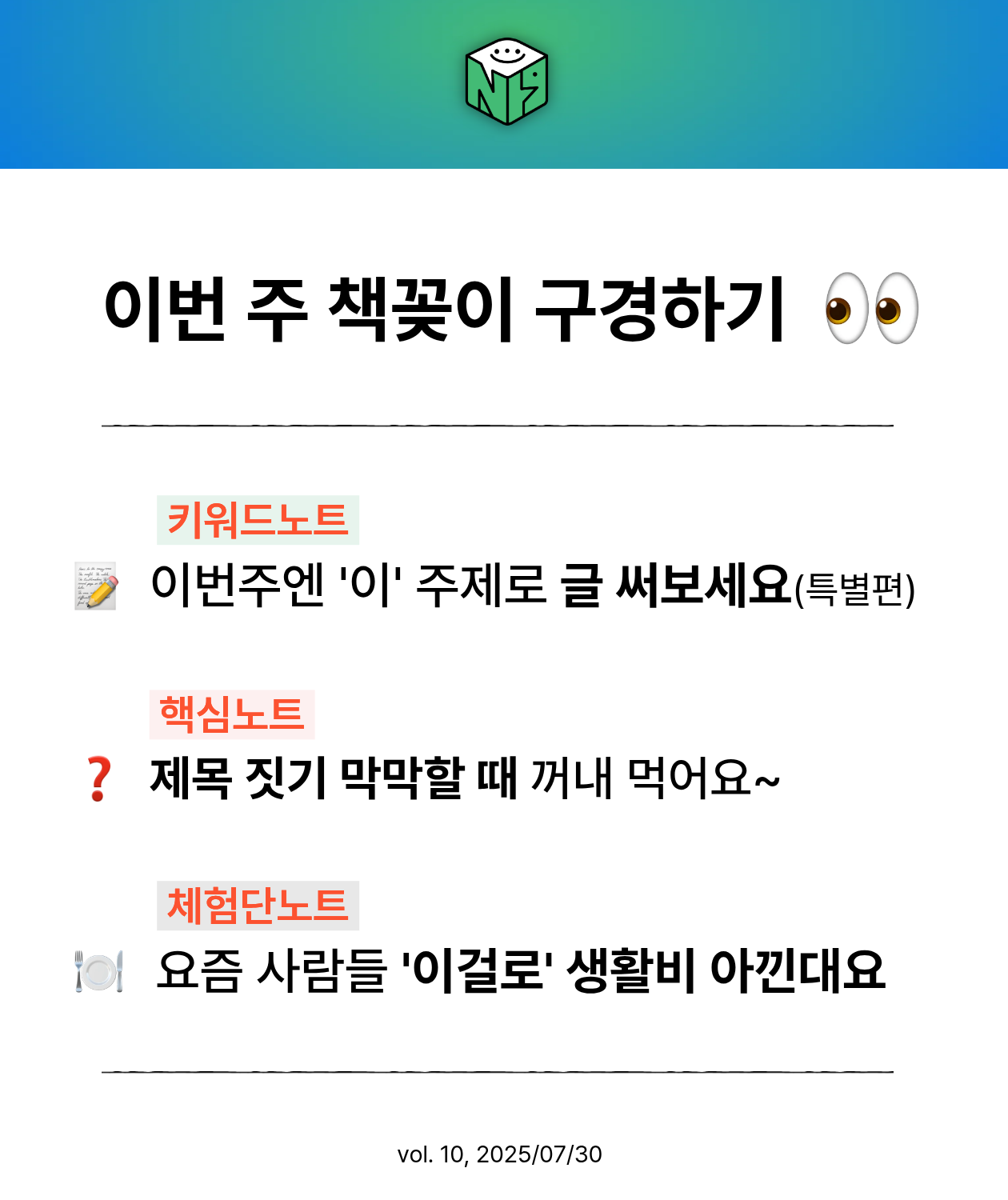 열심히 쓴 글인데도 이상하게 조회수가 안 나온다면? 이 챕터를 집중해 보세요! 가장 먼저 의심해 봐야 할 건 제목이랍니다. 특히 요즘처럼 검색 기준이 점차 까다로워질 땐 제목 하나로 클릭이 갈리기도 하죠. 쉽지만 검색에도 잘 걸리게, 그 제목 공식을 이번 뉴스레터에서 알려드릴게요! |