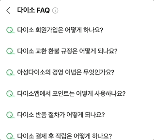 위에서 다이소 예시를 들었으니, 이 챕터도 다이소로 알아볼게요. 네이버 검색에는 다양한 섹션이 있는데, 그중 다양한 질문을 모아둔 [ FAQ ] 라는 게 있답니다. 그냥 지나치는 분들도 정말 많은데요! 블로거라면 이 부분 절대 놓치시면 안 돼요. 완전 노다지(?) 거든요. 목차 구성뿐만 아니라 포스팅 소재도 발굴할 수 있으니 이 얼마나 고마운 섹션인가요! 잠깐만 살펴봐도 [ 회원가입 방법, 교환 환불 규정, 포인트 사용법 ] 등 쓸거리가 무궁무진하죠? |