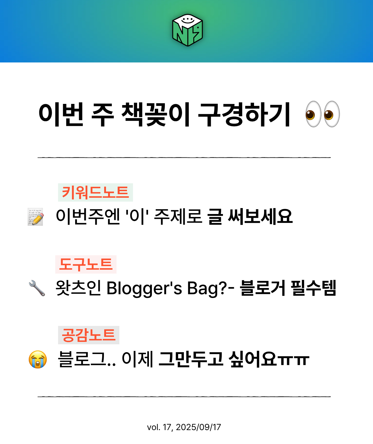 여러분의 블로그, 얼마나 성장하고 있는지 궁금하지 않으세요? 그래서 매월 셋째 주 수요일 뉴스레터에서 무료 블로그 지수 진단 이벤트를 열어볼 거예요! 매달 진행될 예정이니 많은 관심 부탁드릴게요!
