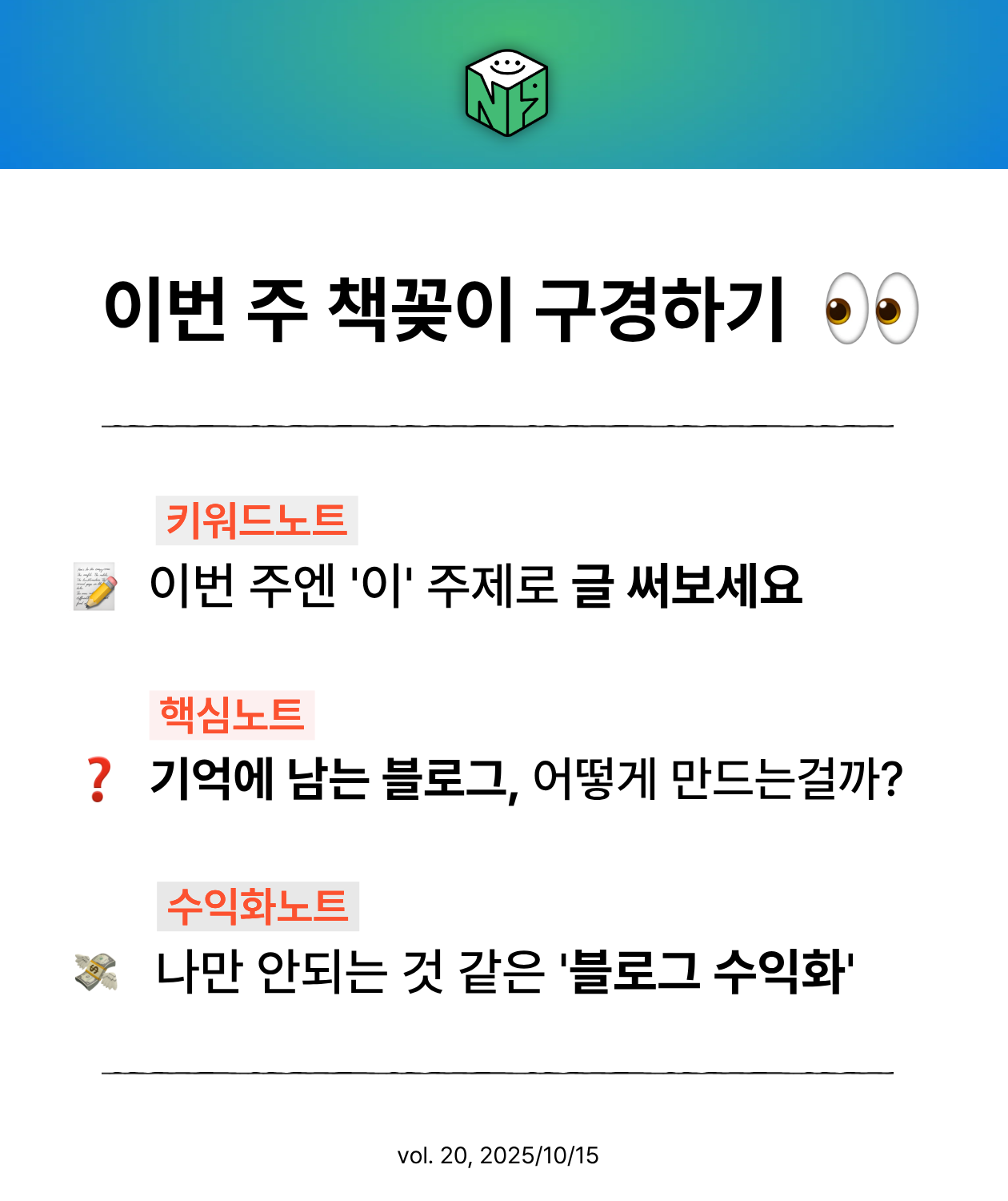 여러분의 블로그, 얼마나 성장하고 있는지 궁금하지 않으세요? 그래서 매월 셋째 주 수요일 뉴스레터에서 무료 블로그 지수 진단 이벤트를 진행 중입니다! 매달 진행되니 선정되지 못했더라도 실망하지 마세요!