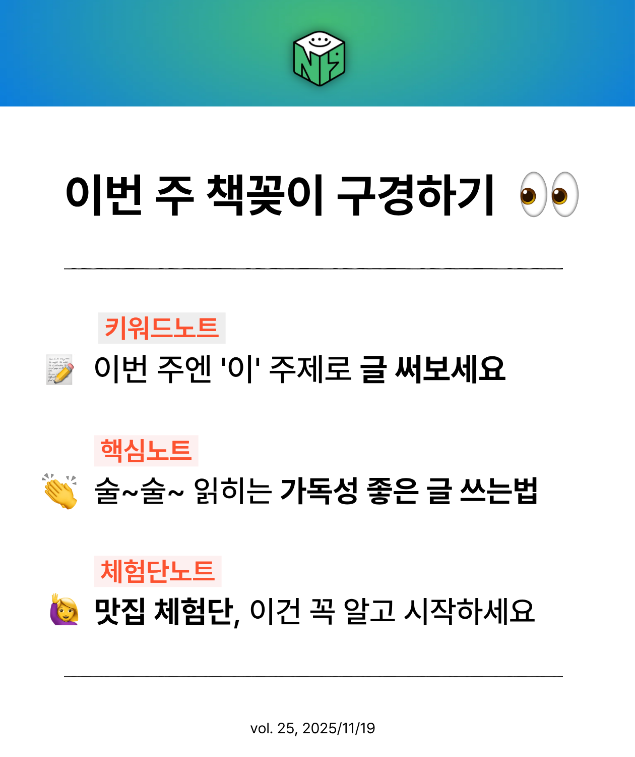 여러분의 블로그, 얼마나 성장하고 있는지 궁금하지 않으세요? 그래서 매월 셋째 주 수요일 뉴스레터에서 무료 블로그 지수 진단 이벤트를 진행 중입니다! 매달 진행되니 선정되지 못했더라도 실망하지 마세요!