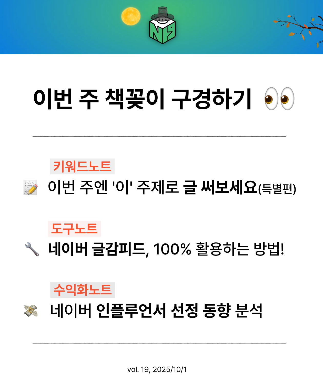 추석을 목전에 두었던 10월 초에 보내드렸던 레터네요! 이달에 꼭 써야 할 키워드 17개와 네이버의 새로운 기능인 '글감'을 소개하고, 요즘 인플루언서 선정 동향을 간단히 분석해봤었죠. 시기 적절한 계절 콘텐츠와 많은 분들이 관심 있는 인플루언서 내용을 담아서 그런지 평소보다 오픈율이 높게 나왔답니다. |