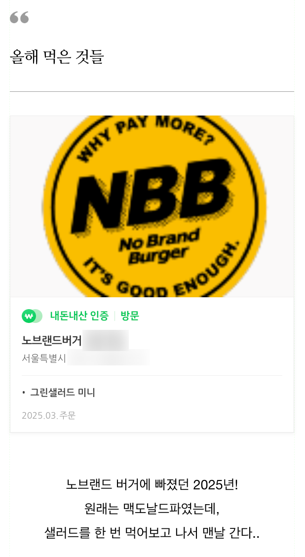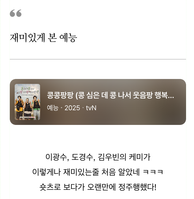 이 문장을 읽는데 괜히 잠깐 멈춰서 블로그 처음 만들던 날이 떠올랐어요. 처음엔 대단한 목표가 있었던 것도 아니고, 돈을 벌겠다는 확실한 계획이 있던 것도 아니었는데 말이죠! 그냥 기록하고 싶어서, 누군가에게 도움이 되는 글을 써보고 싶어서 시작했던 기억이 있네요. 특히나 애드포스트나 협찬, 조회수 같은 것들에 지쳐있었다면 더욱 추천해요. 연말을 맞아 오늘은 함께 과제 하나를 해보시죠! |